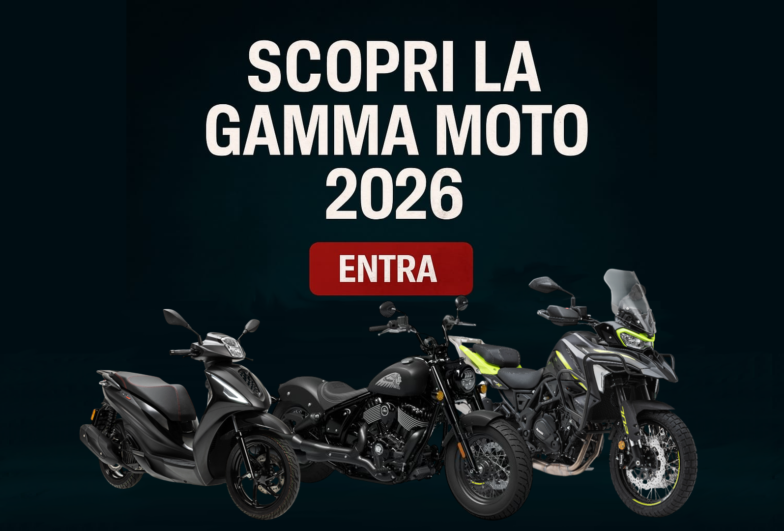 Offriamo una vasta selezione di modelli: Indian, Benelli, Keeway, Morbidelli, Cyclone, Benda, SWM, NIU, Honda Redmoto offroad e Valenti.