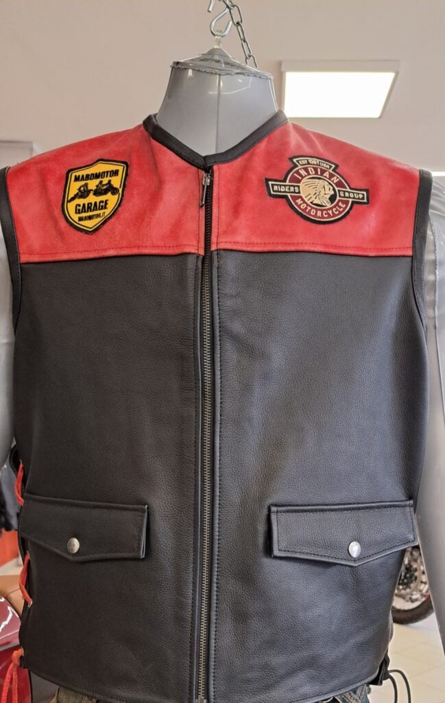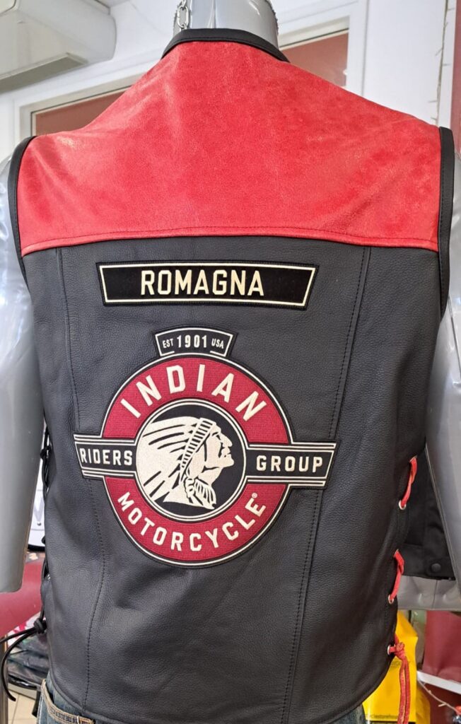 IMR Romagna si contraddistingue grazie al suo gilet in vera pelle, realizzato completamente in Italia, che sfoggia i colori iconici di Indian Motorcycle e patch originali IMR.