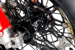 Ruote Bartubeless e Pneumatici Metzeler Le ruote a raggi nere Bartubeless, da 17″ all’anteriore e da 17″ al posteriore, sono leggere e resistenti grazie al sistema tubeless integrato garantisco affidabilità e performance superiore su strada e fuoristrada. Montano pneumatici slick Metzeler Racetec SM, per garantire il massimo livello di aderenza, trazione e agilità. |